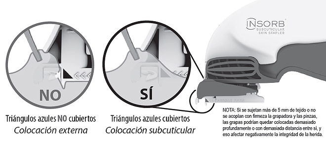 Acople firmemente la grapadora con la pinza Adson directamente bajo la flecha y accione la grapadora pulsando con firmeza y suavidad hasta escuchar un clic; luego suelte. Levante la grapadora verticalmente hacia arriba para retirarla. |
